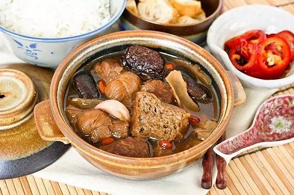 肉骨茶是流行于马来西亚和新加坡,是以肉与骨配合中药煲成的汤,当中加入当归、枸杞、玉竹、党参、桂皮、牛七、熟地、西洋参、甘草、川穹、八角、茴香、桂香、丁香、大蒜及胡椒,熬煮多个小时制成入味可口的浓汤。