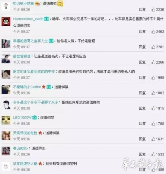 5月3日,华西都市报发布的一篇微博“动车上拒和老人挤着坐遭指责”,引发网友热议
