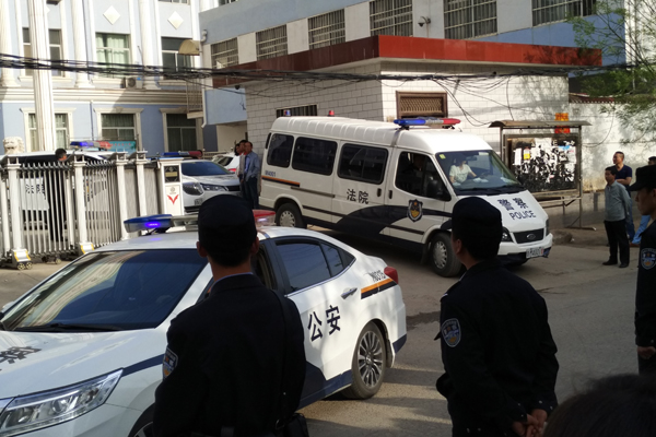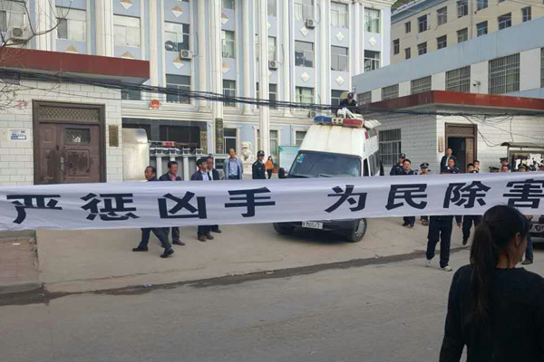 被害人亲属打出条幅“严惩凶手 为民除害”