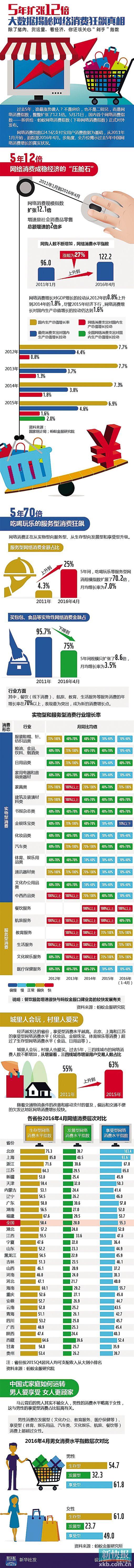 数据显示,过去五年,网络消费规模指数扩张12.1倍,增速为社会消费品零售总额增速的2倍多;网络消费水平指数从2011年1月的96.0上升到2016年4月的122.2,涨幅为27.2%。
