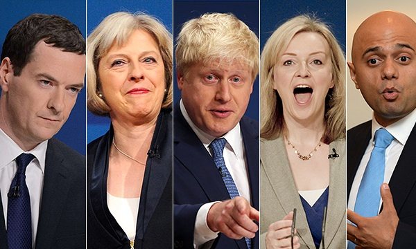 英国首相热门候选人:乔治·奥斯本(George Osborne), 特蕾莎·梅(Theresa May), 鲍里斯·约翰逊(Boris Johnson),伊丽莎白·特拉斯(Elizabeth Truss),贾维德(Sajid Javid)
