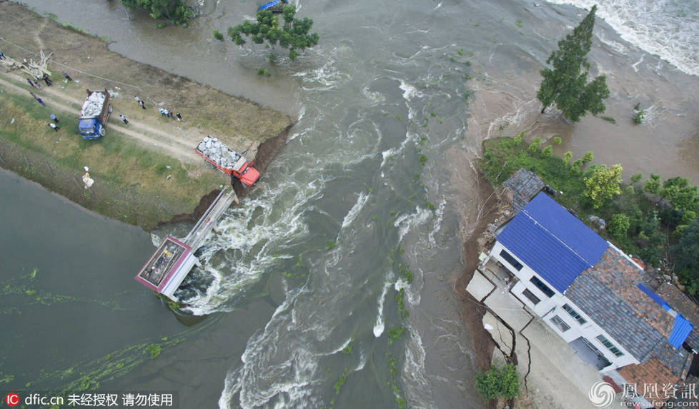 身系安全绳的抢险人员驾驶着载满麻石的卡车驶向溃口,在卡车坠入溃口前跳下卡车,用连车带石的方式堵溃口。