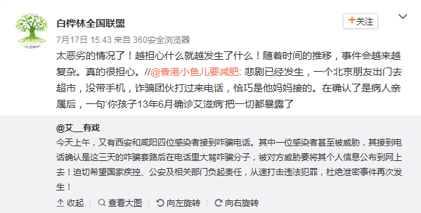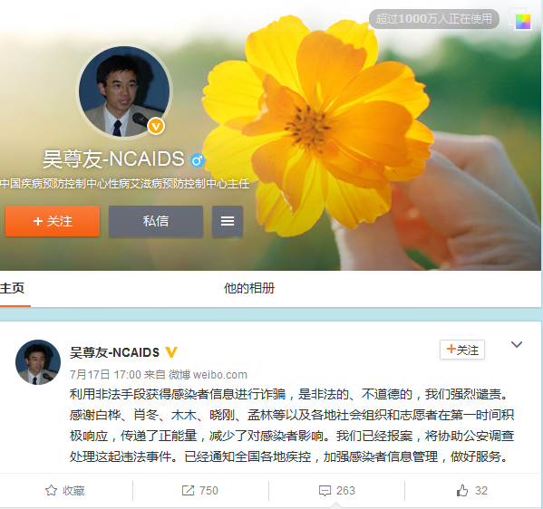 17日下午,中国疾病预防控制中心性病艾滋病预防控制中心主任吴尊友在微博中表示,利用非法手段获得感染者信息进行诈骗,是非法的、不道德的,对此表示强烈谴责。