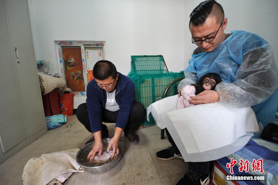 11月1日,山西太原动物园,饲养员“奶爸”照顾半岁大的“弃婴”小猩猩。2016年5月2日,该园雌性黑猩猩“老七”顺利产下宝宝。因为这批非洲黑猩猩系首次繁育,缺乏经验,“老七”把孩子晾在一边,不闻不问,小猩猩成为一名“弃婴”。于是,饲养员吴晋源、刘嶂鑫、赵璟、朱向博将小猩猩抱回育婴室,当起了全职奶爸,给它梳洗喂奶,教它翻身站立,期待小猩猩长大后能够顺利回归种群。图为一位“奶爸”洗毛巾,一位“奶爸”安抚小猩猩。 韦亮 摄