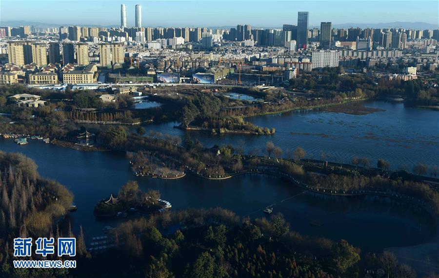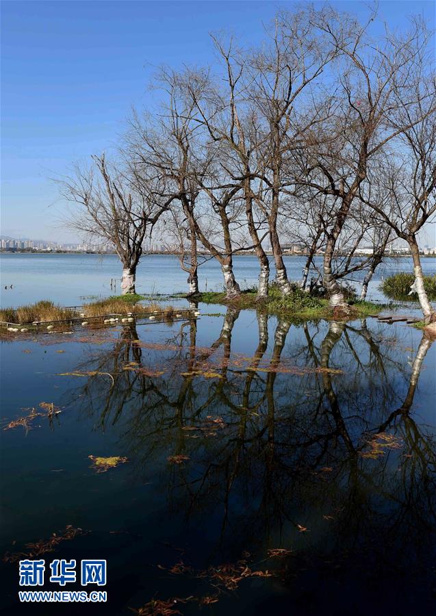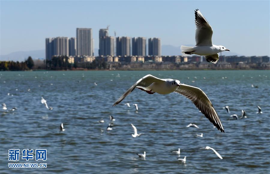 红嘴鸥在滇池上空飞翔(2月5日摄)。别了,劣V类!戴着这顶帽子31年的昆明滇池,2016年打了一个翻身仗:全年水质首次由劣V类提升为V类。一字之变,价值不凡。专家认为,这是滇池治理的里程碑进展,也是我国环境保护和水污染治理的标志性成果。黯然失色多年的“高原明珠”,逐渐重新焕发昔日神采! 新华社记者 蔺以光 摄
