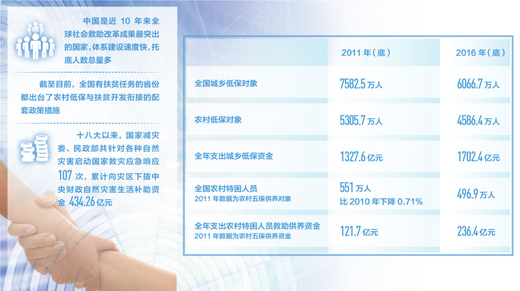 困难家庭平时可领取低保金,患病时可获得医疗救助,孩子上学可享受分类施保,遭遇特殊困难时还可申请临时救助……5年来,针对困难群众生活的方方面面,党和政府高度重视底线民生保障的顶层制度设计,颁布《社会救助暂行办法》,不断加大财政投入。日益完善的社会救助体系,让越来越多的困难群众得到了及时帮扶。