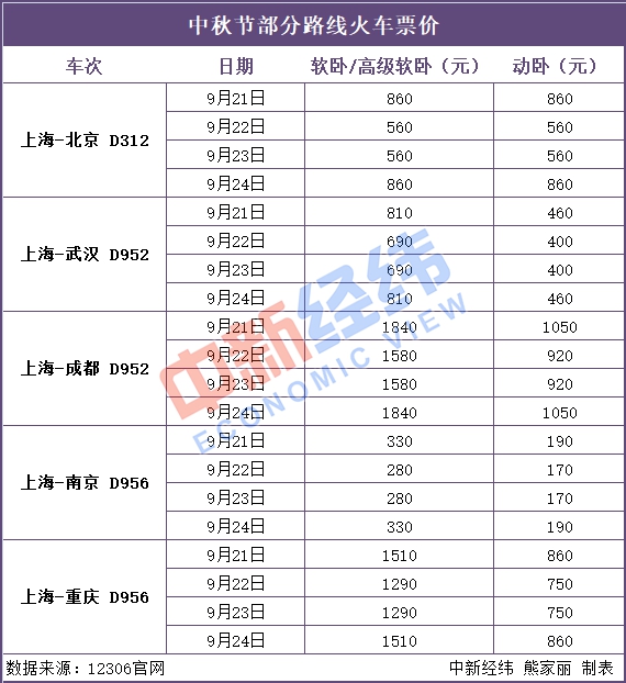 以中秋节从上海出发为例。中新经纬客户端查询上海-北京、上海-武汉、上海-成都、上海-南京、上海-重庆等线路部分车次,发现中秋节前一日(21日)和最后一日(24日)的火车票价格较高,与22日、23日相比,要高出20-300元不等。以上海-北京D312车次为例,21日软卧和动卧票价,均比22日高出300元。