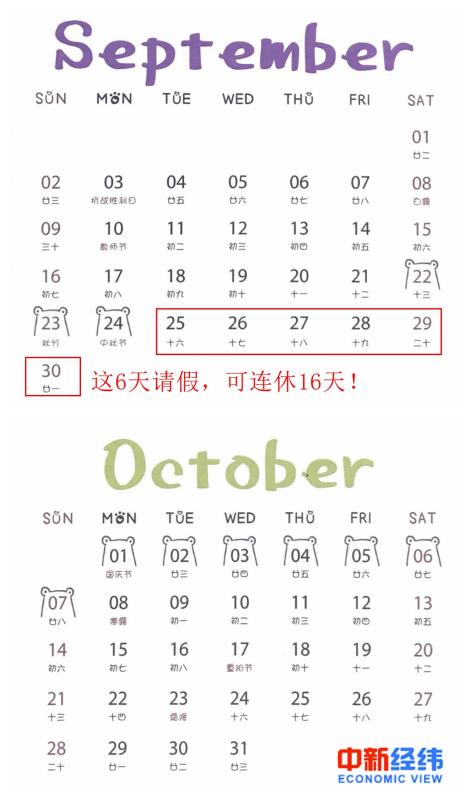 据悉,今年中秋节放假时间为9月22日至24日,国庆节放假时间为10月1日至7日。只要能在25日-30日请假6天,中秋节和国庆节便可连休16天。