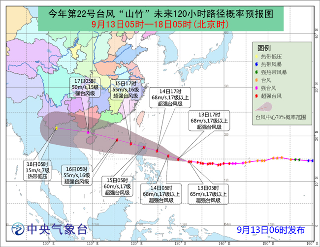 从中央气象台获悉,备受关注的今年第22号台风“山竹”今早(9月13日)的路径再次发生调整。受副热带高压的压制,其路线进一步西调,预计未来有可能先登陆菲律宾吕宋岛北部,再进入南海,向我国华南沿海趋近。