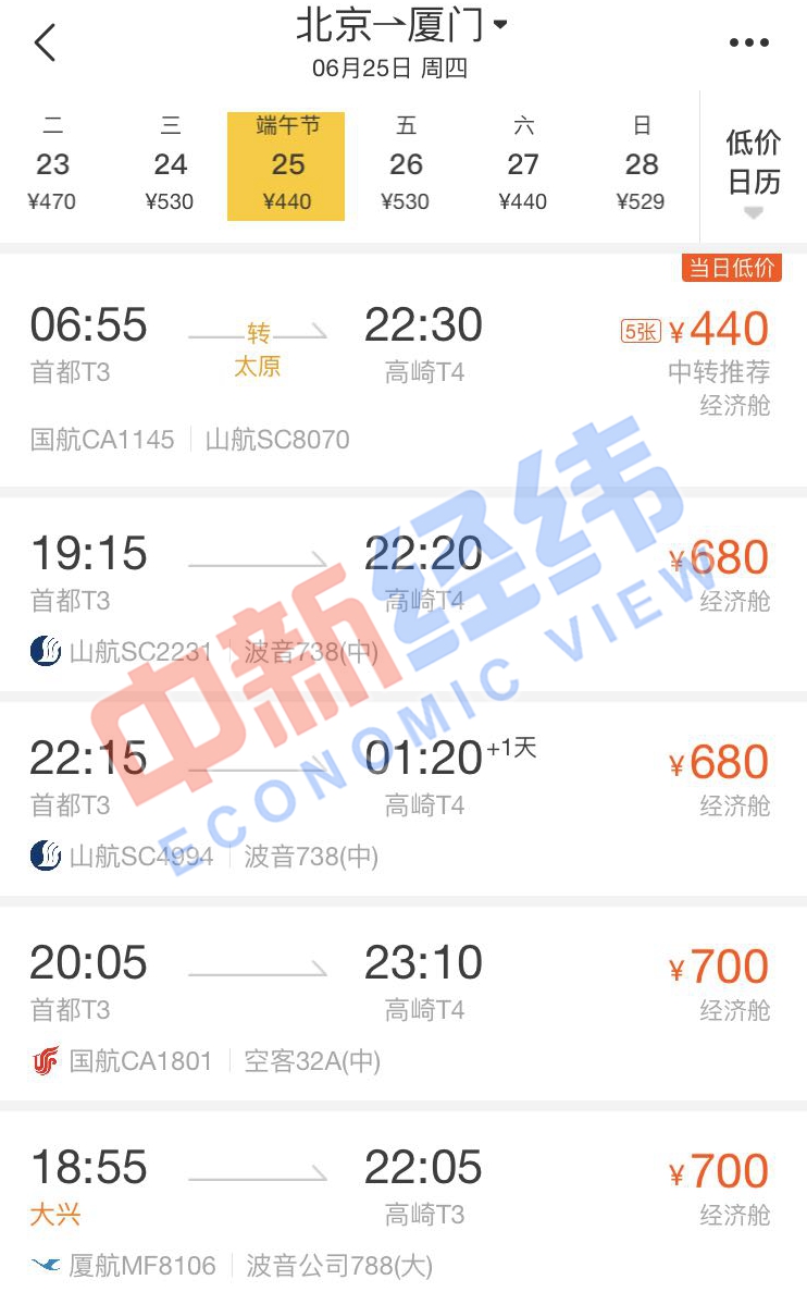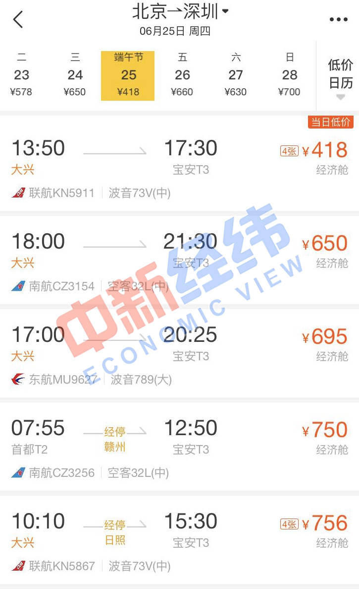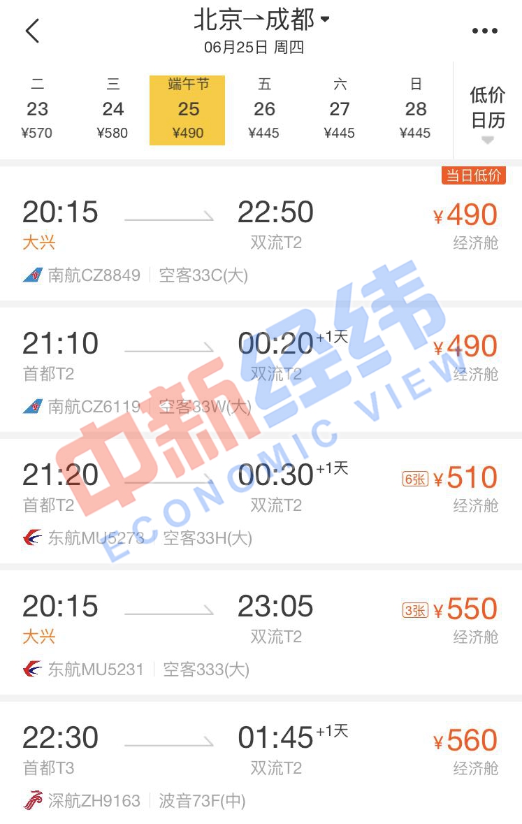 面对即将到来的端午节假期,即使没有买到高铁票也没关系。通过第三方售票平台发现,端午节当天,北京到多个城市的机票价格比高铁还实惠,个别航班甚至便宜超一半。