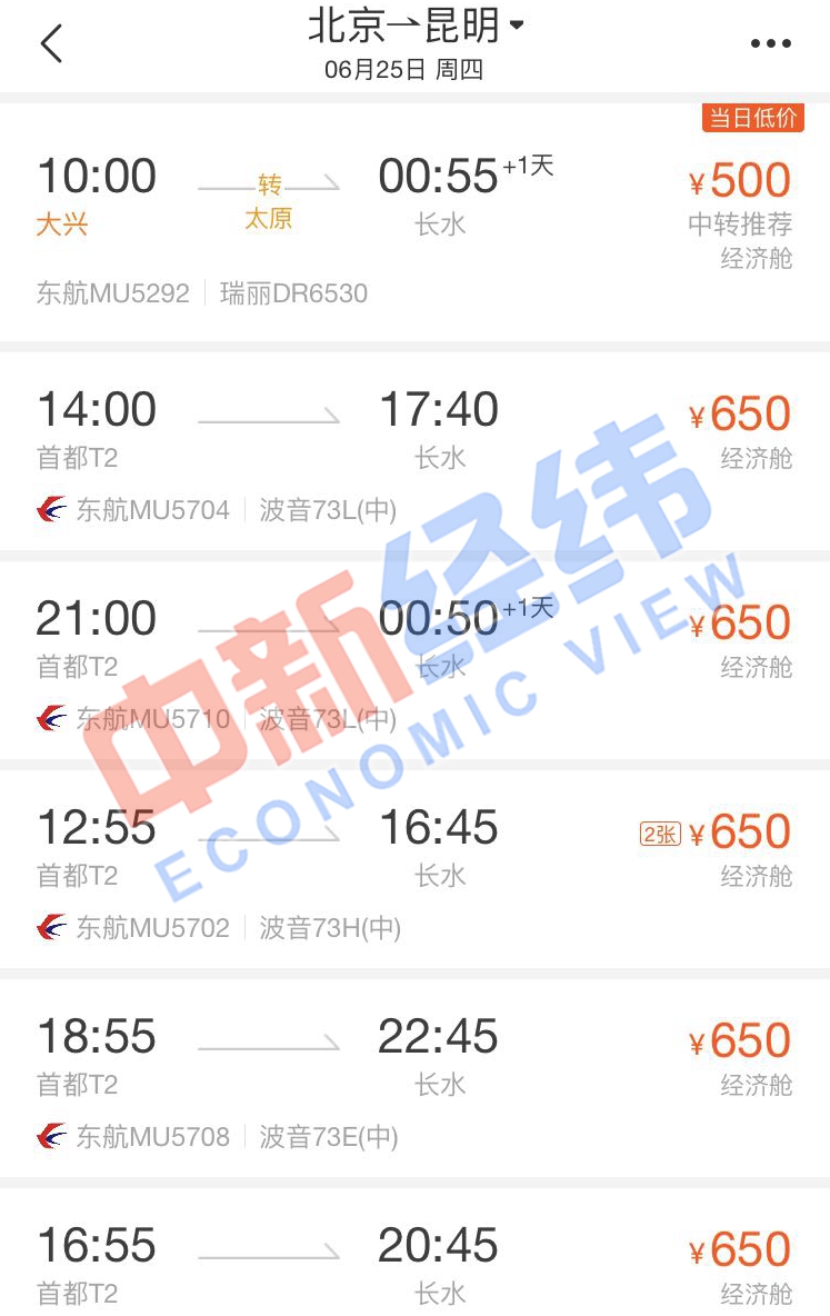 北京—昆明MU5292、MU5704、MU5710、MU5702、MU5708、MU5706、MU9027、MU5718、MU5292、MU9710、CZ3997、3U8723、3U8838、CZ6159、CA4174、KN5255等16个航班机票价格分别为500元、650元、650元、650元、650元、650元、700元、700元、700元、700元、800元、870元、870元、1000元、1000元、1017元。两地间高铁二等座需1147.5元。