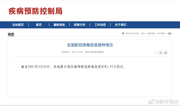 最大规模集中疫苗接种来了!国家卫健委25日发布,截至2021年3月24日,各地累计报告接种新冠病毒疫苗8585.97万剂次。