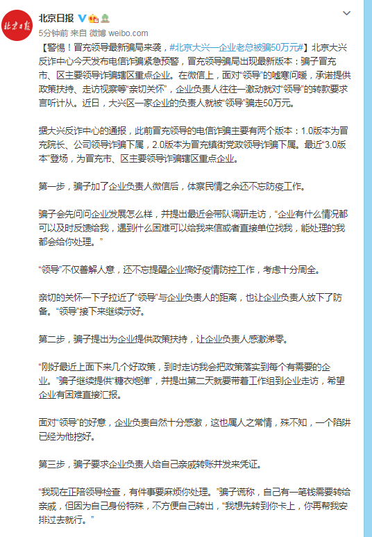 北京大兴反诈中心今天发布电信诈骗紧急预警,冒充领导骗局出现最新版本:骗子冒充市、区主要领导诈骗辖区重点企业。在微信上,面对“领导”的嘘寒问暖,承诺提供政策扶持、走访视察等“亲切关怀”,企业负责人往往一激动就对“领导”的转款要求言听计从。近日,大兴区一家企业的负责人就被“领导”骗走50万元。