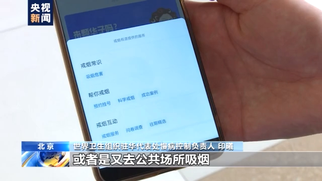 世界卫生组织驻华代表处慢病控制负责人 印曦:去主动去了解一下吸烟到底对自己有什么样的身体上边的一个损害,不是说就脑子里泛泛的知道,吸烟有害健康,那转眼又去吸烟,或者是又去在公共场所吸烟。一时戒不断的话,请不要在公共场所吸烟,不要把你自己吸烟的自由建立在别人,损害别人的健康上。