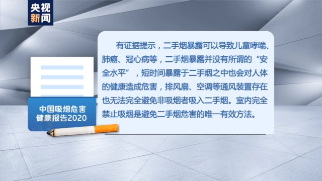 有证据提示,二手烟暴露可以导致儿童哮喘、肺癌、冠心病等,二手烟暴露并没有所谓的“安全水平”,短时间暴露于二手烟之中也会对人体的健康造成危害,排风扇、空调等通风装置存在也无法完全避免非吸烟者吸入二手烟。室内完全禁止吸烟是避免二手烟危害的唯一有效方法。