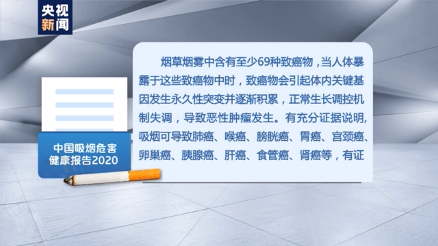报告指出,烟草烟雾中含有至少69种致癌物,当人体暴露于这些致癌物中时,致癌物会引起体内关键基因发生永久性突变并逐渐积累,正常生长调控机制失调,导致恶性肿瘤发生。有充分证据说明,吸烟可导致肺癌、喉癌、膀胱癌、胃癌、宫颈癌、卵巢癌、胰腺癌、肝癌、食管癌、肾癌等,有证据提示,吸烟可以增加急性白血病、鼻咽癌、结直肠癌、乳腺癌的发病风险。