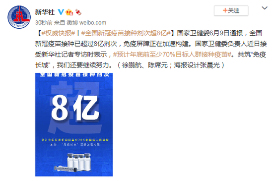 国家卫健委6月9日通报,全国新冠疫苗接种已超过8亿剂次,免疫屏障正在加速构建。国家卫健委负责人近日接受新华社记者专访时表示,预计年底前至少70%目标人群接种疫苗。共筑“免疫长城”,我们还要继续努力。