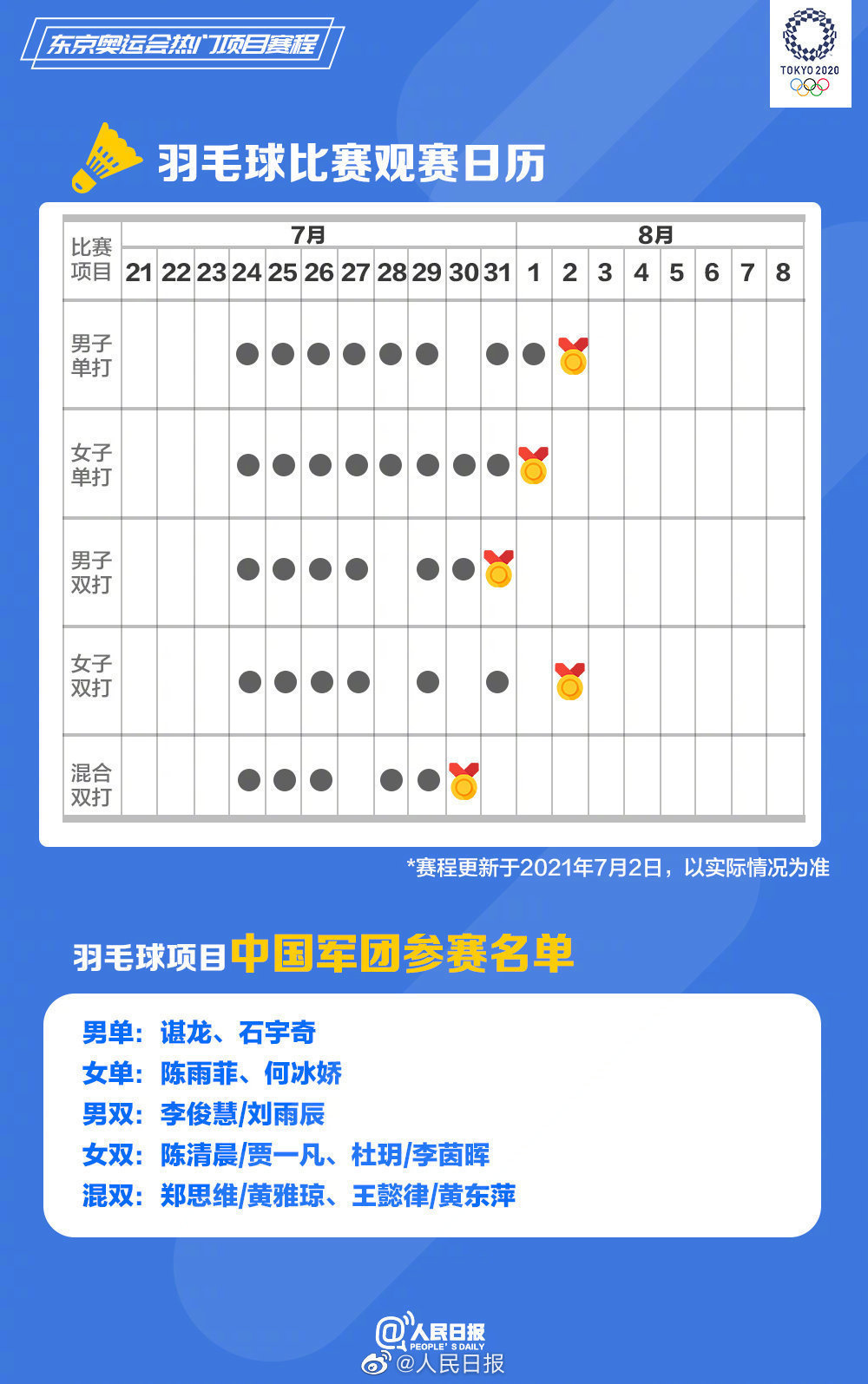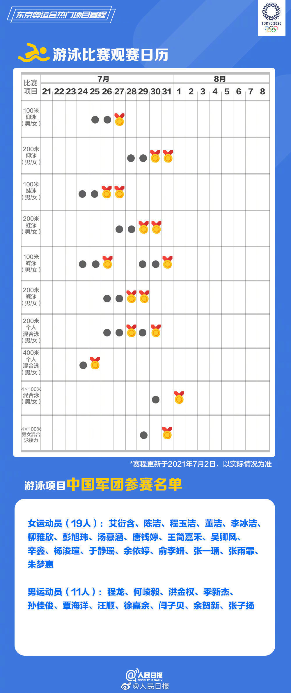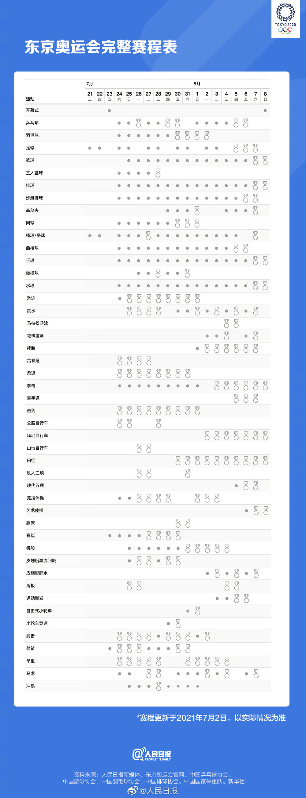 距东京奥运会开幕只剩不到两周,中国多个项目代表队公布奥运名单。乒乓球、羽毛球、跳水、游泳、女排…你关注的比赛什么时候进行?将在哪天产生金牌?有你喜爱的运动员吗?收藏这份东京奥运会赛程,一起看奥运,中国队,加油!