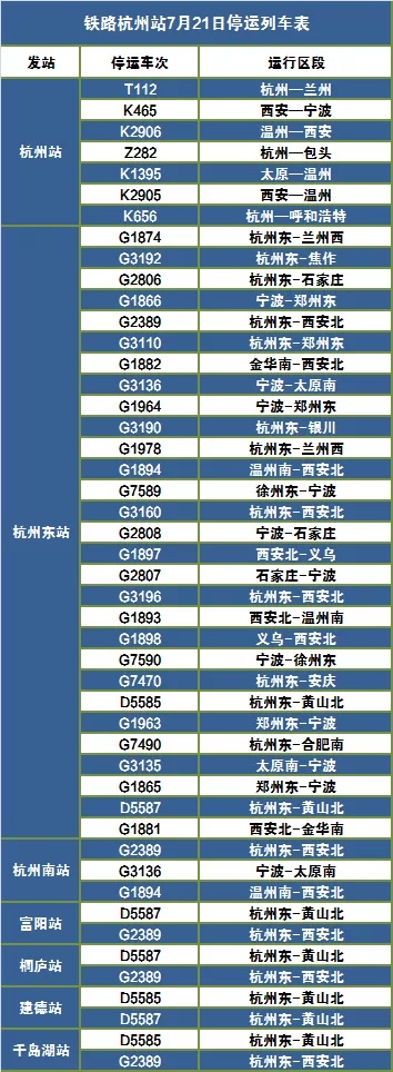 受连日河南特大暴雨影响,杭州往郑州方向多趟列车停运,铁路杭州站目前梳理了21日部分停运列车车次信息,具体如下: