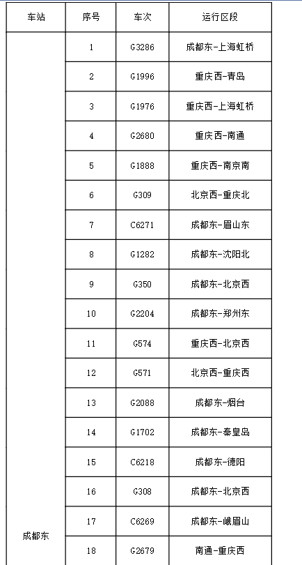 受河南暴雨影响,7月21日,中国铁路成都局集团公司成都车站管内42趟列车停运,包括到上海、青岛、北京等方向,具体车次如下: