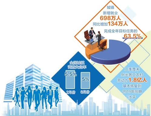 今年上半年,城镇新增就业698万人,完成全年目标任务的六成;全国城镇调查失业率从2月份的5.5%,逐步回落至6月份的5%,失业水平逐步恢复到疫情前水平;二季度100个城市公共就业服务机构市场求人倍率为1.58,劳动力市场需求增加。