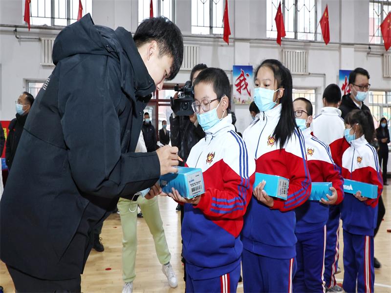 中经联播讯(朱淑英)在中国冰壶联赛伊春站比赛即将开幕之际,12日下午,国家体育总局副局长李颖川,冬季运动管理中心主任倪会忠,省政府副秘书长马里,省体育局局长钱福永、副局长庄士超一行人等来到冬奥冠军高亭宇的母校——伊春市南岔县东方红学校,为那里的学生捐赠了50双冰刀。冬奥冠军高亭宇出席活动并观看了学生运动员的训练,还与滑冰小将们亲切互动,为他们签名留念。