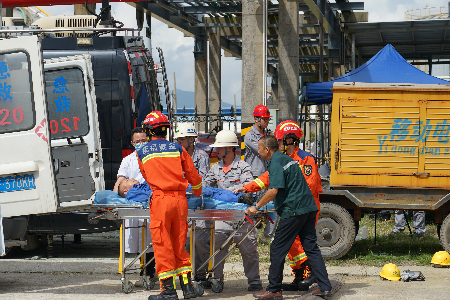演练模拟瓮福紫金化工股份有限公司液氨罐区发生泄漏,导致现场3名检修人员被困。公司接到报告后,立即启动企业应急预案,调配人员增援现场应急处置工作及现场先期处置,并上报上杭县人民政府和相关部门。上杭县政府第一时间组织相关部门和救援力量赶赴事故地点,成立现场救援指挥部,开展救援工作,并向龙岩市政府及省应急厅上报险情。省厅接报后高度重视,立即调派福建省危化应急救援泉州石化队、福建省危化应急救援联合石化队两支专业危化队伍,赶赴现场开展堵漏作业,经过约一个小时的紧张抢修,完成了堵漏作业。