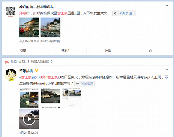 1月25日,多位网友上传富士康着火的图片,称郑州富士康一栋大楼昨日发生火灾,从上传的视频中,可以看到现场浓烟滚滚,网友称期间还发生了爆炸。