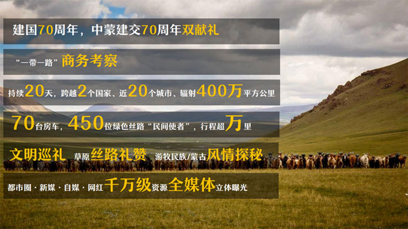 为庆祝建国70周年、中蒙建交70周年双献礼,2019“草原丝路”房车文化万里行开启“一带一路”商务考察,持续20天、跨越2个国家、近20个城市、辐射400万平方公里,70台房车,450位绿色丝路“民间使者”,行程超万里。这是一次文明的巡礼,草原丝路礼赞,和游牧民族、蒙古风情的探秘。