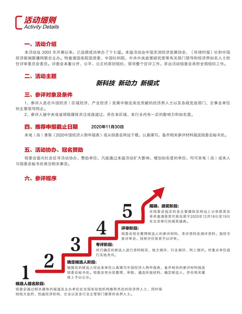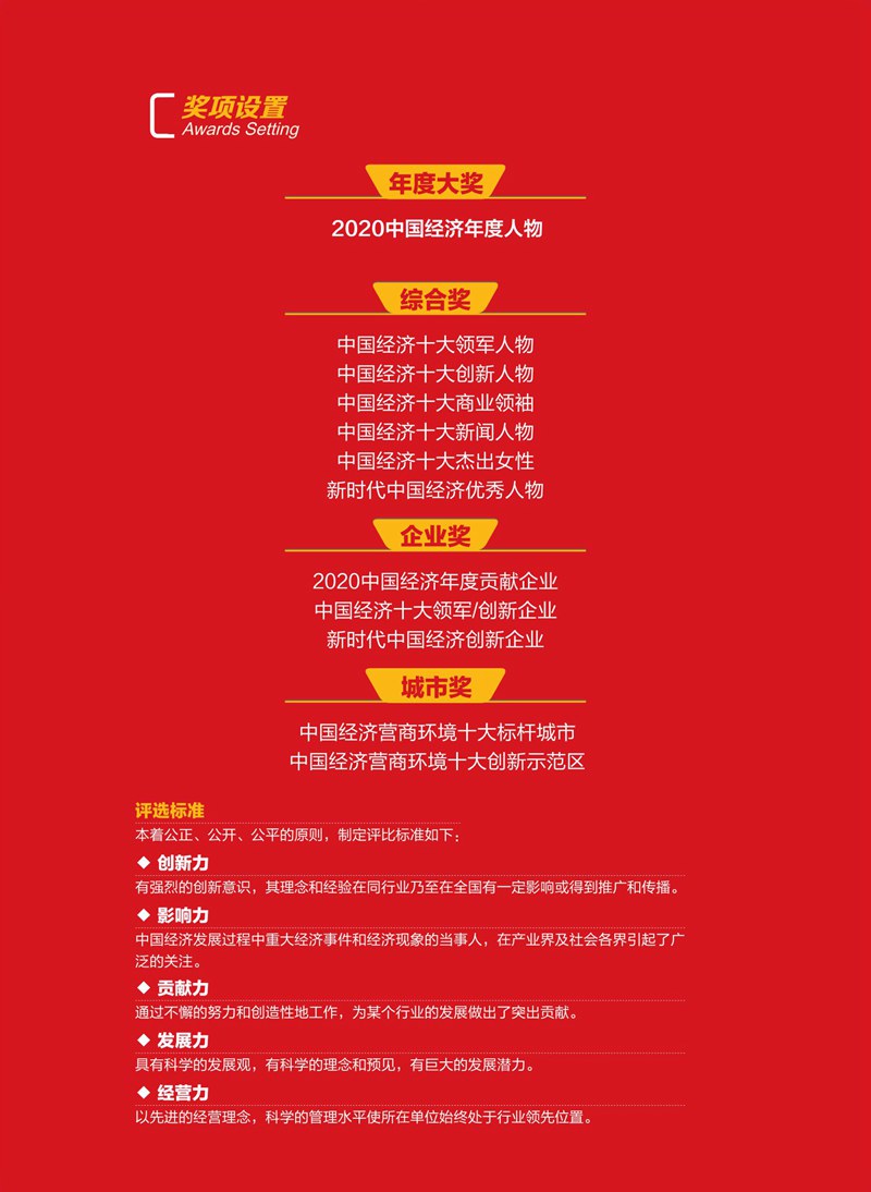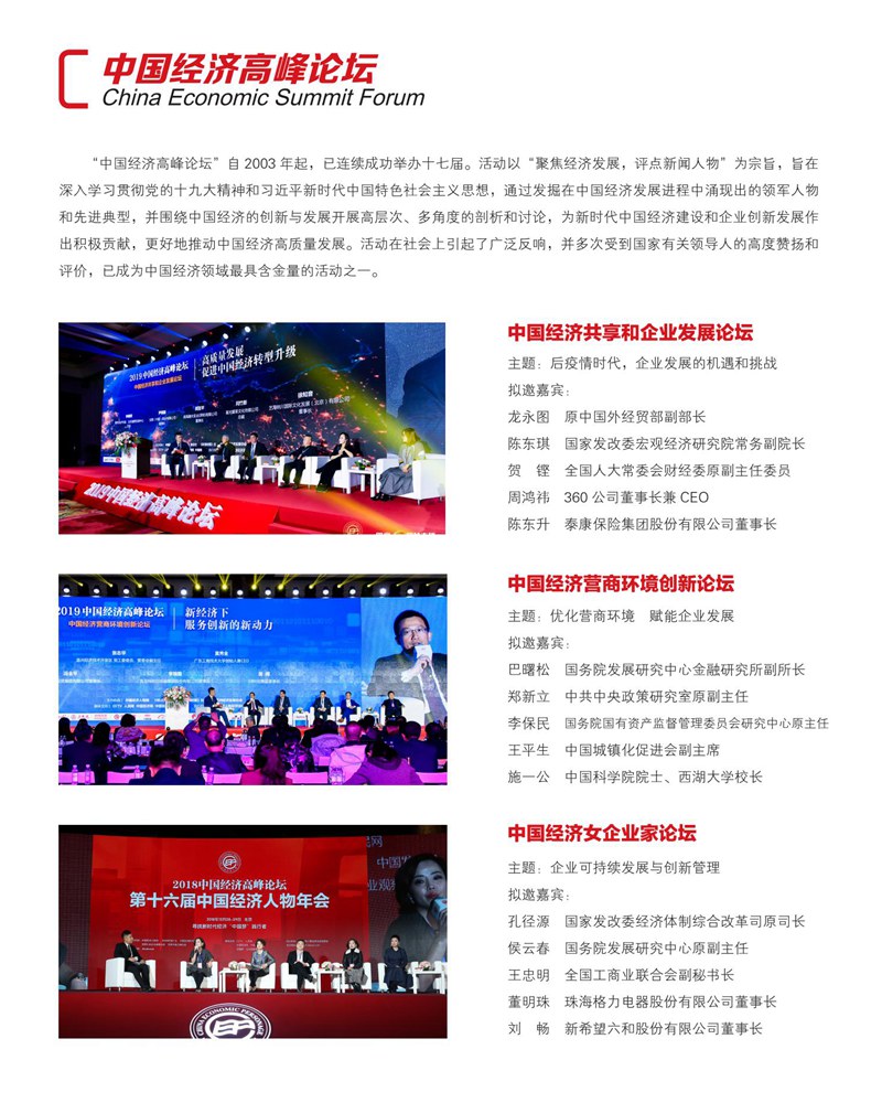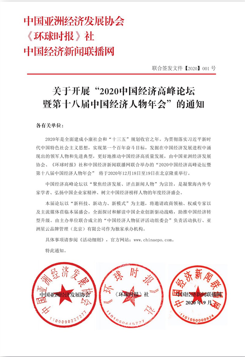 2020年12月18日-19日,由中国亚洲经济发展协会、《环球时报》社、《中国经济新闻联播》网联合主办的“2020中国经济高峰论坛暨第十八届中国经济人物年会”将在北京隆重召开。中国经济高峰论坛以“聚焦经济发展、评点新闻人物”为宗旨,受到国家有关领导人的高度赞扬和评价,是中国经济界最具影响力的评选活动之一。本届论坛以“新科技、新动力、新模式”为主题,邀请政商领袖、权威专家以及主流媒体莅临盛会,全面探讨和解读中国企业创新驱动战略,助推中国经济转型升级。